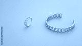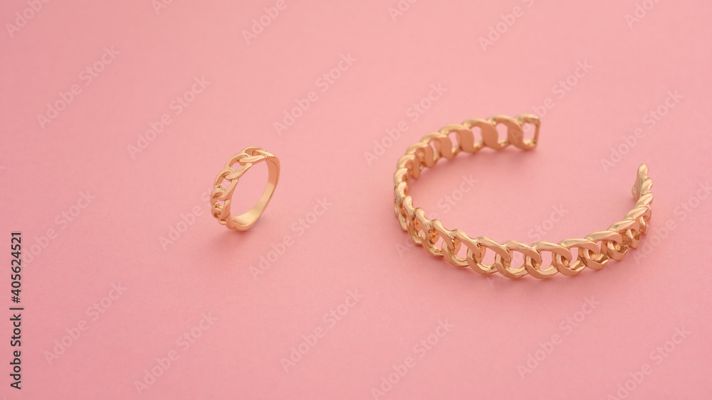 Top view of chain shape golden bracelet and ring on pink background