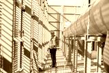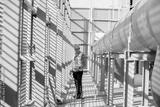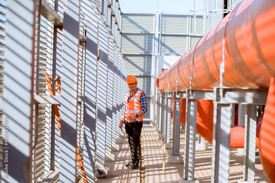 Engineer under checking the industry cooling tower air conditioner is water condenser cooling tower air chiller HVAC of large industrial building to control air system.