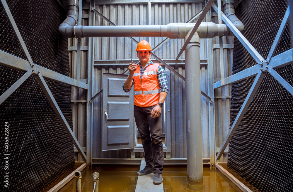 Engineer under checking the industry cooling tower air conditioner is water condenser cooling tower air chiller HVAC of large industrial building to control air system.