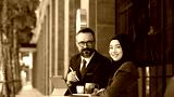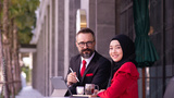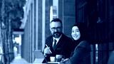 Muslim business woman wearing hijab and caucasian businessman, Marketing plan Market analysis With the future world business.