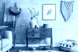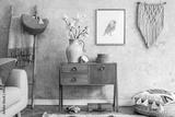 Modern retro composition of living room with wooden vintage commode, sofa, rattan pouf, ladder, macrame, carpet, pillow, gold mock up poster frame, flowers, decoration and personal accessories.