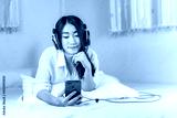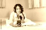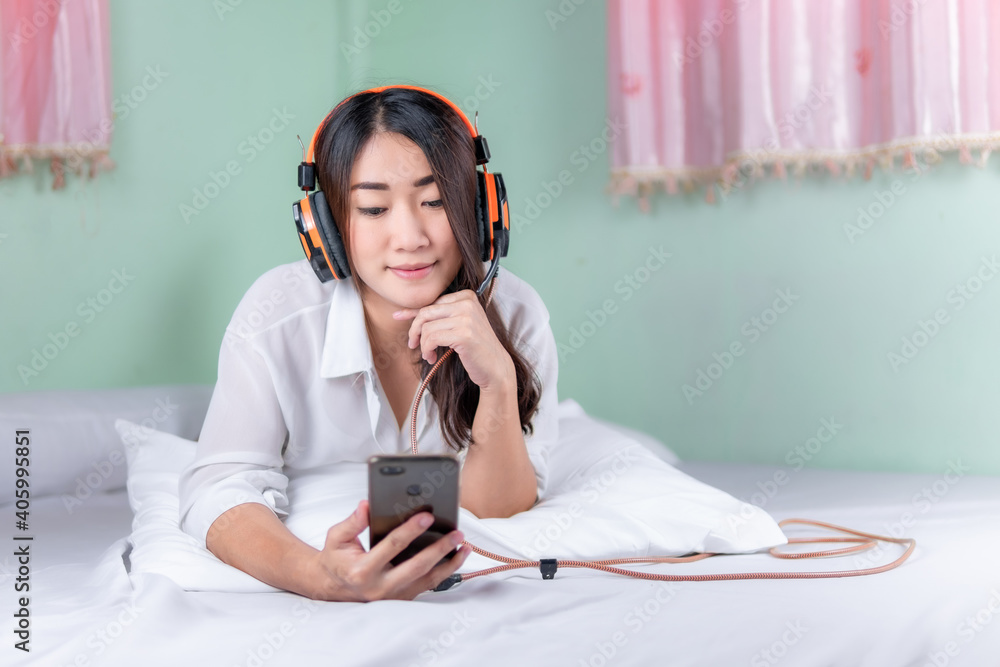 Woman smiling.Beautiful Asian women wearing white shirts listening to happy music in the morning room.