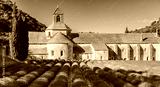 The Romanesque Cistercian Abbey of Notre Dame of Senanque set amongst flowering lavender fields, near Gordes, Provence, France