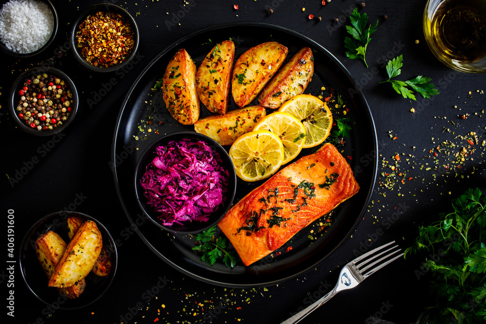Fried salmon fillet with fried potatoes, red cabbage and lemon served on black plate on wooden table