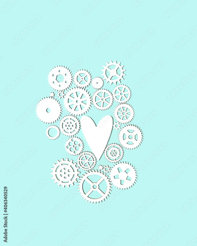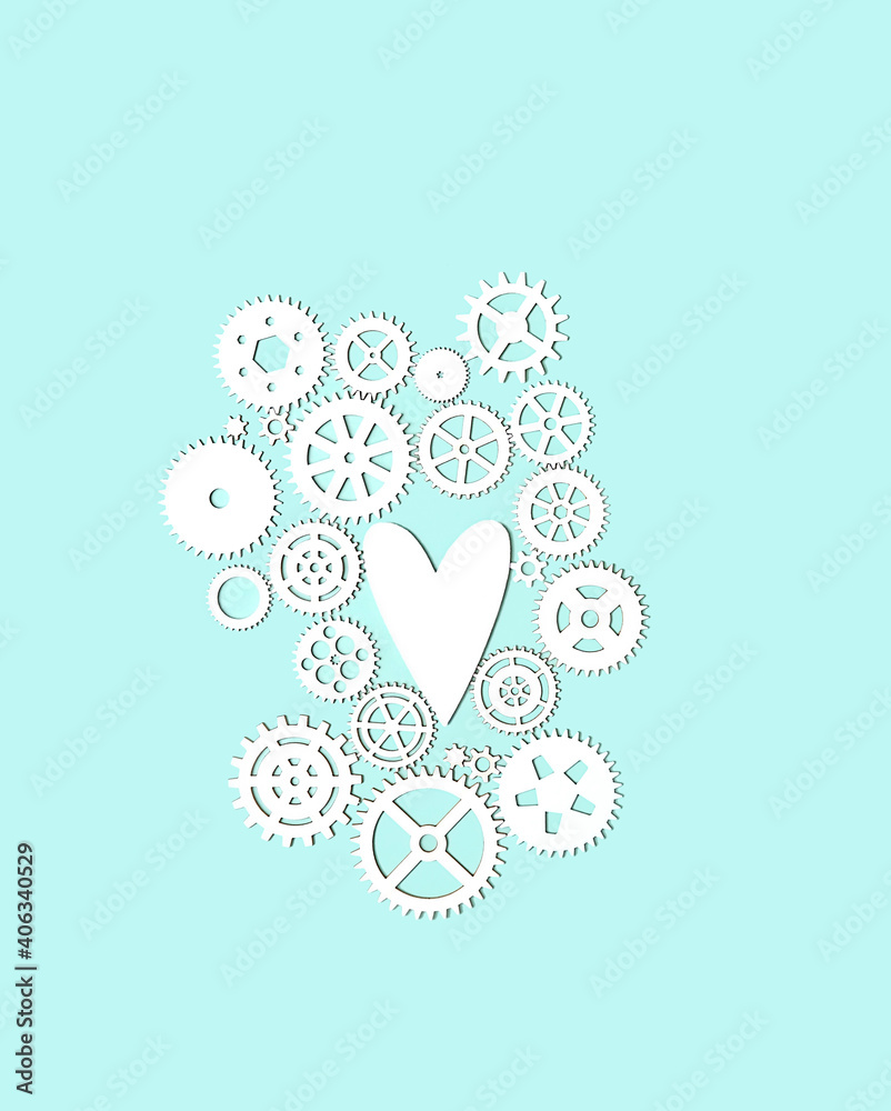 white paper cogwheels and heart on blue background. symbol of love. Valentine's day, 14 or 23 february holiday, man's concept. creative minimal style.