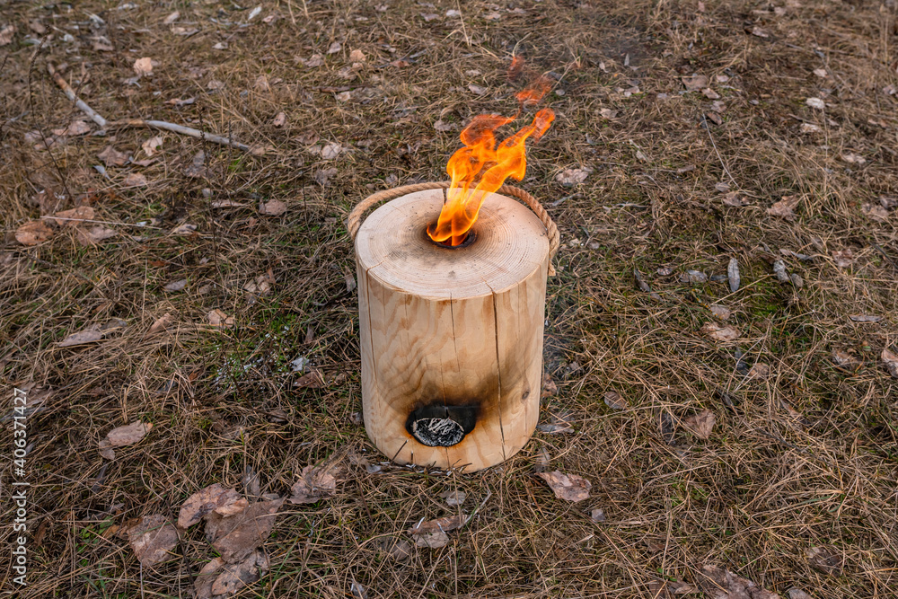 Vertical fire of Finnish (Swedish) log candle at river coast