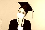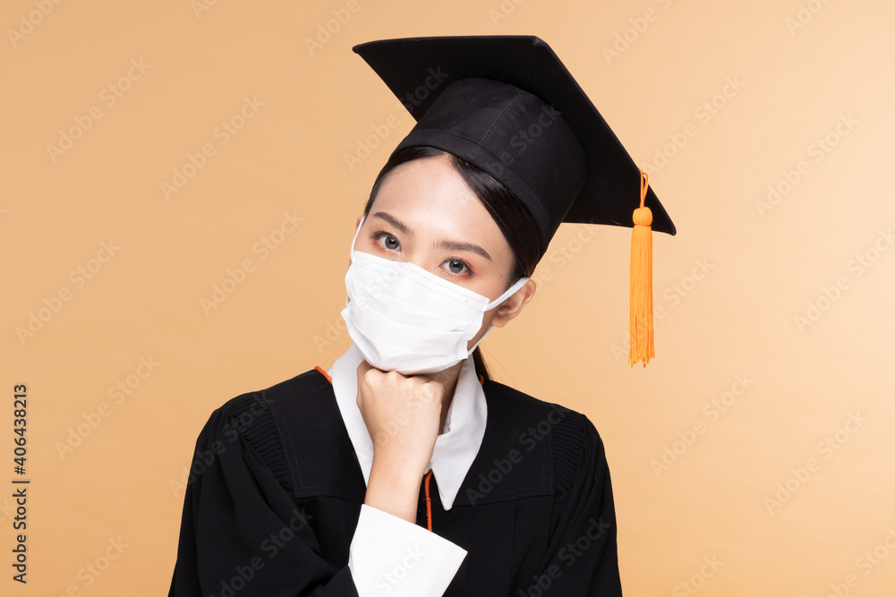 Attractive Asian woman graduated in cap and gown wear medical mask smile so proud and happiness due Virus outbrake and COVID-19 virus flu pandemic on Beige background,New normal of graduation concept