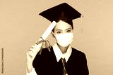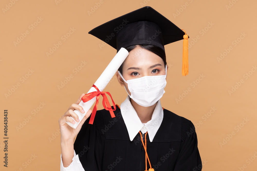 Attractive Asian woman graduated in cap and gown wear medical mask smile so proud and happiness due Virus outbrake and COVID-19 virus flu pandemic on Beige background,New normal of graduation concept
