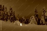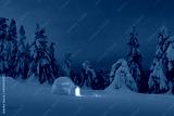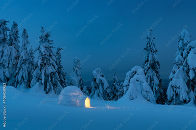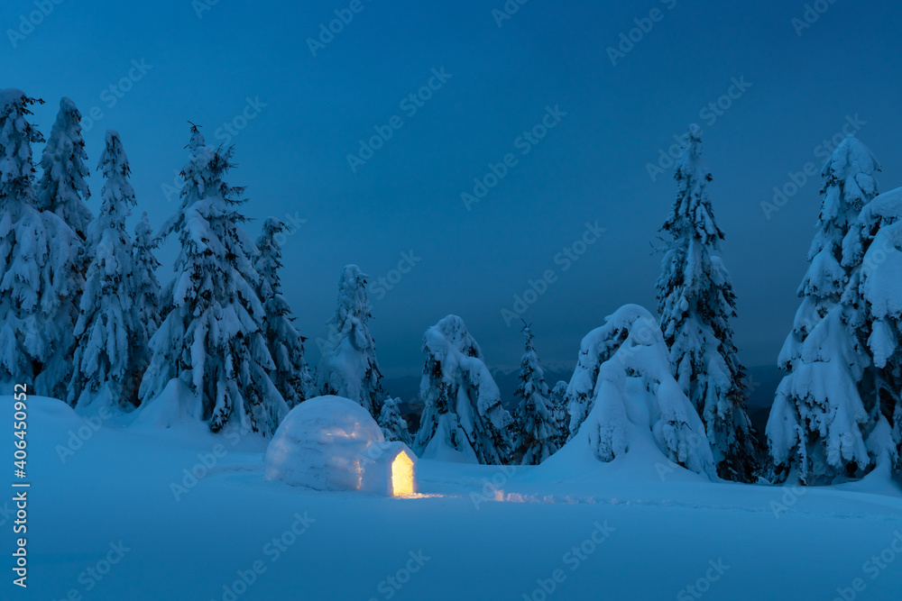 Snow igloo luminous from the inside in the winter mountains. Snow-covered firs in the evening light in the background. Landscape photography