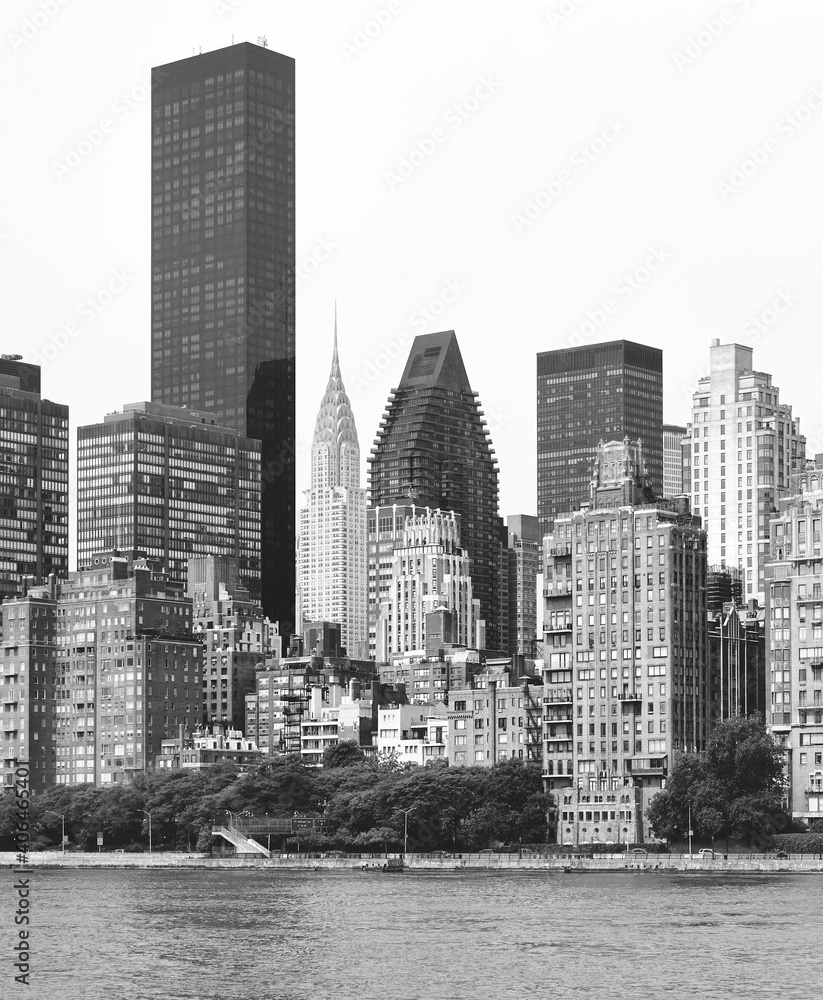 Black and white picture of New York City East River waterfront, US.