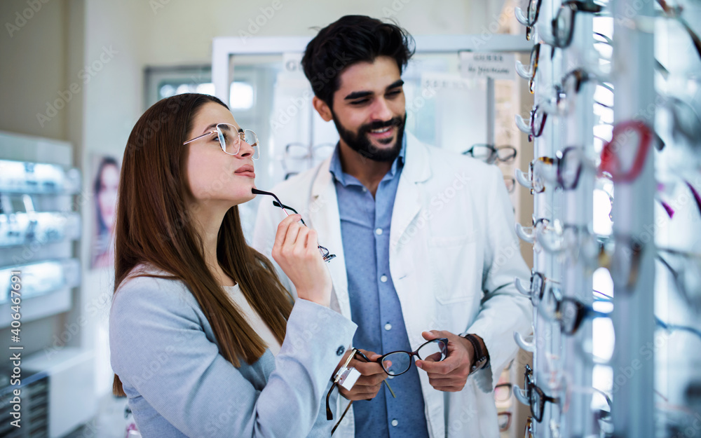 Young woman in optic store choosing a new glasses. Medical, health care concept