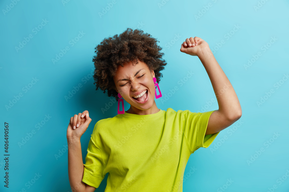 Overjoyed African American woman makes winning gesture expresses happiness raises arms and dances carefree celebrates victory dressed in t shirt isolated over blue background. Female triumphant