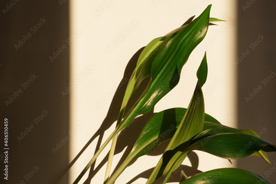Green houseplants home decoration on white background. Home gardening concept. The leaves of the plant are drawn to the sun Indoor garden in sun light with copy space. Horizontal orientation