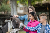 Happy children having fun at farm ranch and meeting a donkey