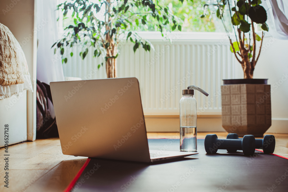A glass water bottle, laptop, yoga mat and dumbbells on the floor in the bedroom for home exercising. Home online workout concept. Fitness online training. Soft selective focus. Copy space.