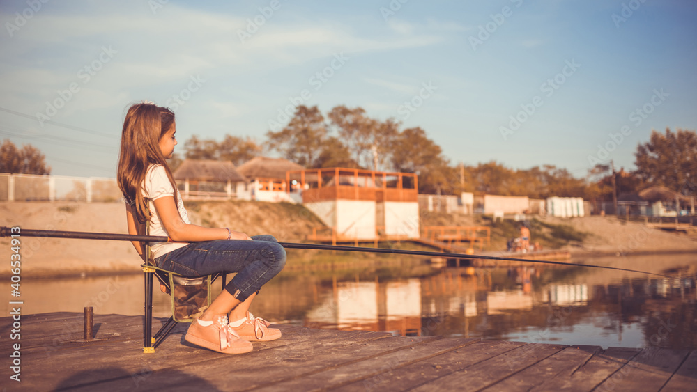 Cute child fishing on a lake in a sunny summer day.