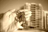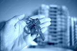 Close-up of key with keychain in shape of house in hand. On the background is multi-storey residential building. Concept of buying and insuring real estate, apartments, mortgages. Copy space..