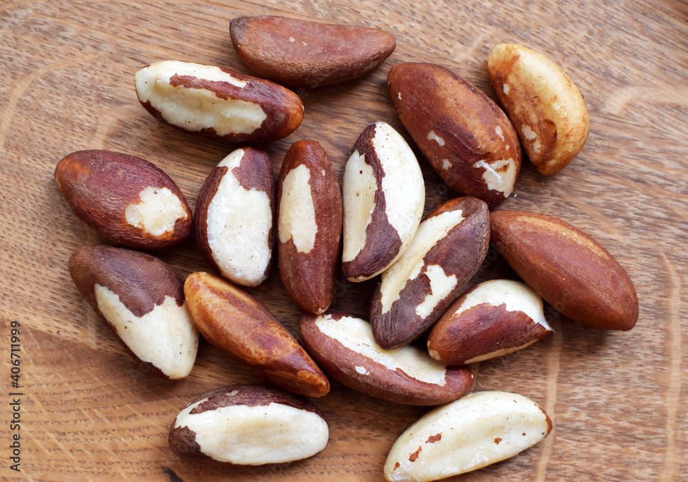 Peeled Brazil nuts on a wooden background. A source of beneficial trace elements and fats. Bertholletia.