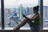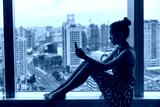 Woman using mobile phone relaxing by condo window at home or office room silhouette. Business woman at work pensive looking at cellphone social media app. Mental health online addiction concept.