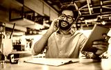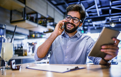 Young businessman sitting in a cafe and working with tablet, making a notes. Business, education, lifestyle concept
