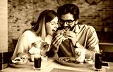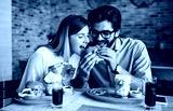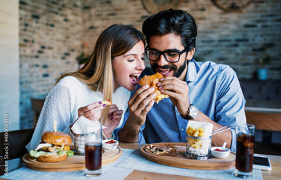 Young couple sitting in a cafe, having breakfast. Love, dating, food, lifestyle concept