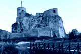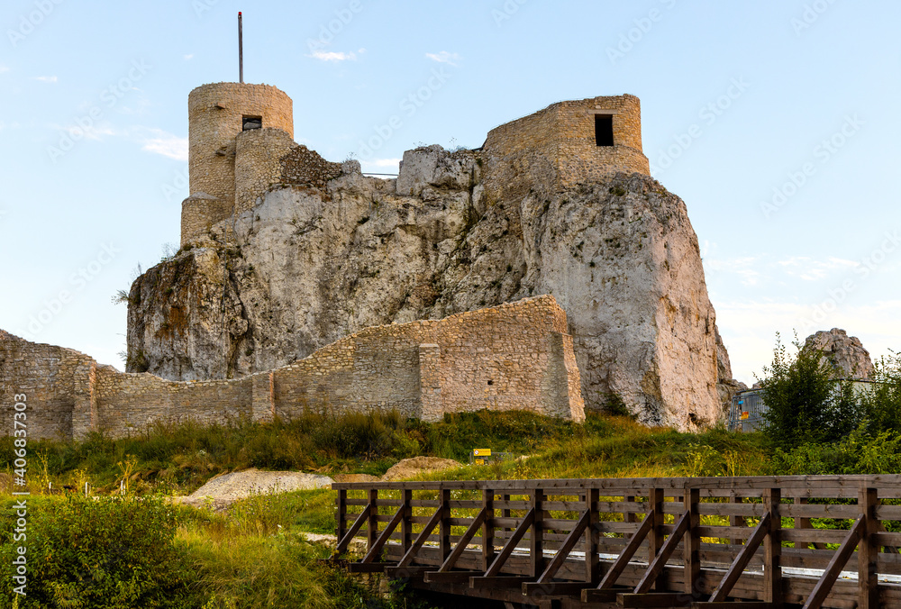 Panoramic view of medieval royal Rabsztyn Castle ruins under renovation in Rabsztyn, Lesser Poland