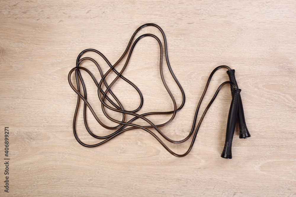 Black skipping rope on wooden background