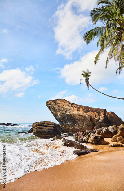 Tropical beach with rocks and coconut palm trees on a sunny summer day.