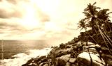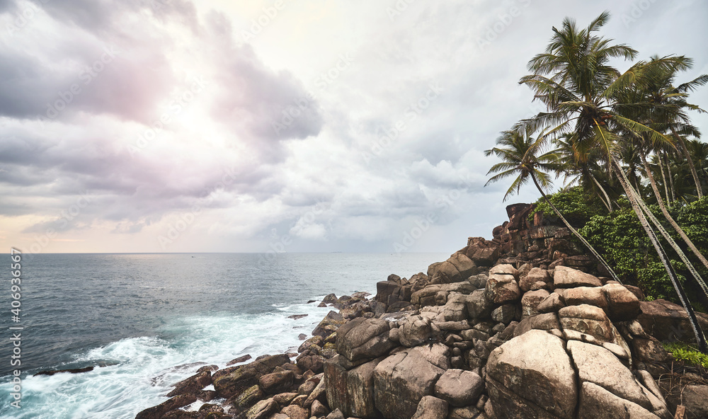 Rocky coast at sunset, color toned picture, Sri Lanka.