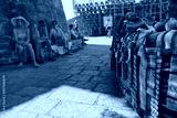 Funny image from the summer vacation in city. Stall with winter hats in the center of the summer resort in hot summer time. Family vacation in Croatia. Tourists tired of heat in the background.