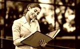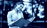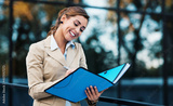 Young businesswoman standing in front of the corporation and signs documents. Business, education, lifestyle concept