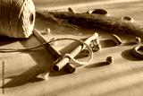 Macrame accessories on beige background. Creative hobby concept. Top view. Vintage color filter