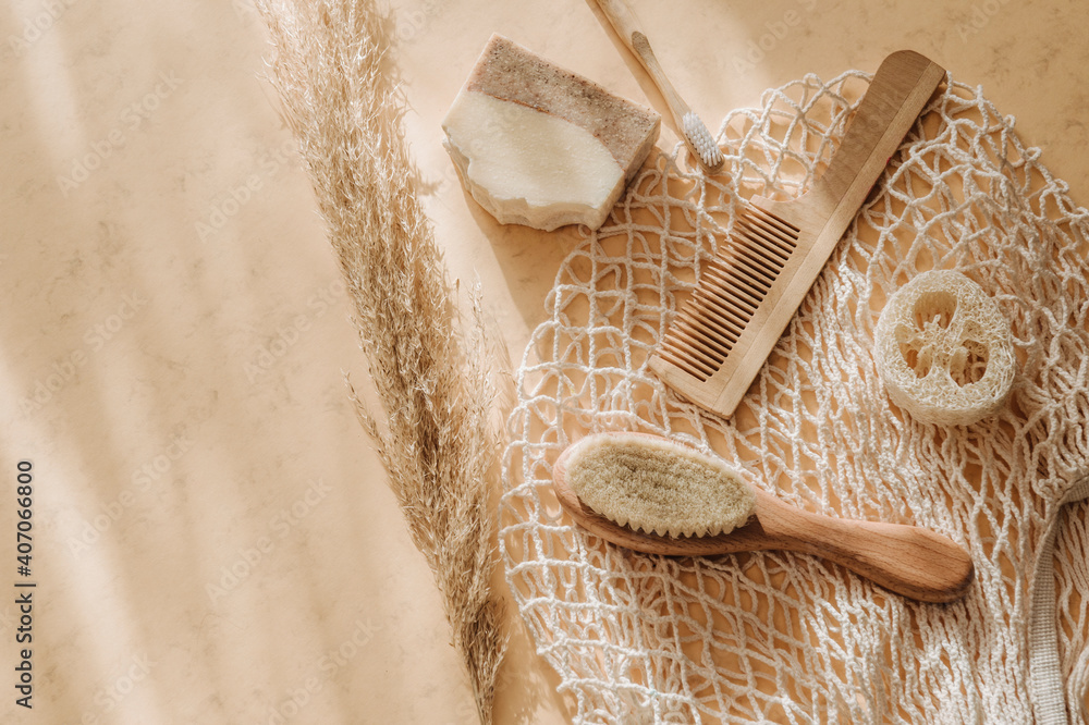 Zero waste bathroom accessories hairbrush, bamboo toothbrush, loofah and natural soap in reusable shopping bag on beige background. Top view. Vintage color filter
