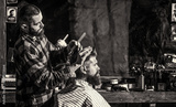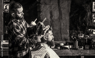 Barber scissors, barber shop. Vintage barbershop, shaving. Man hairstylist. Beard man in barbershop. Hairstylist serving client at barber shop, bearded.