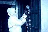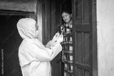 Young woman doctor in medical uniform holding a syringe and coronavirus vaccine, standing with village women explaining importance of corona virus vaccine