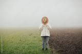 Young woman with hat standing on the green grass field and earth. Copy space.