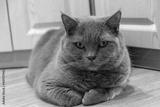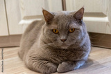 Beautiful gray British cat lies with its legs crossed and looks at the camera