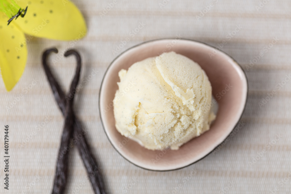 Kugel Vanilleeis mit Vanilleschoten und Blüte von oben