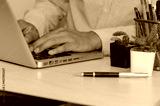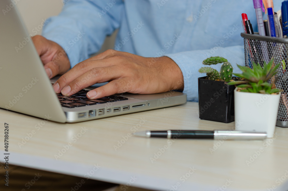 Business men are using computers to find information, the Internet, social network or online businesses work from home.