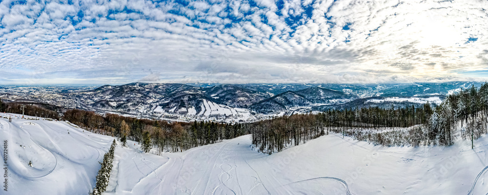 góry zimą, Beskid Śląski w Polsce z lotu ptaka, widok z Czantorii