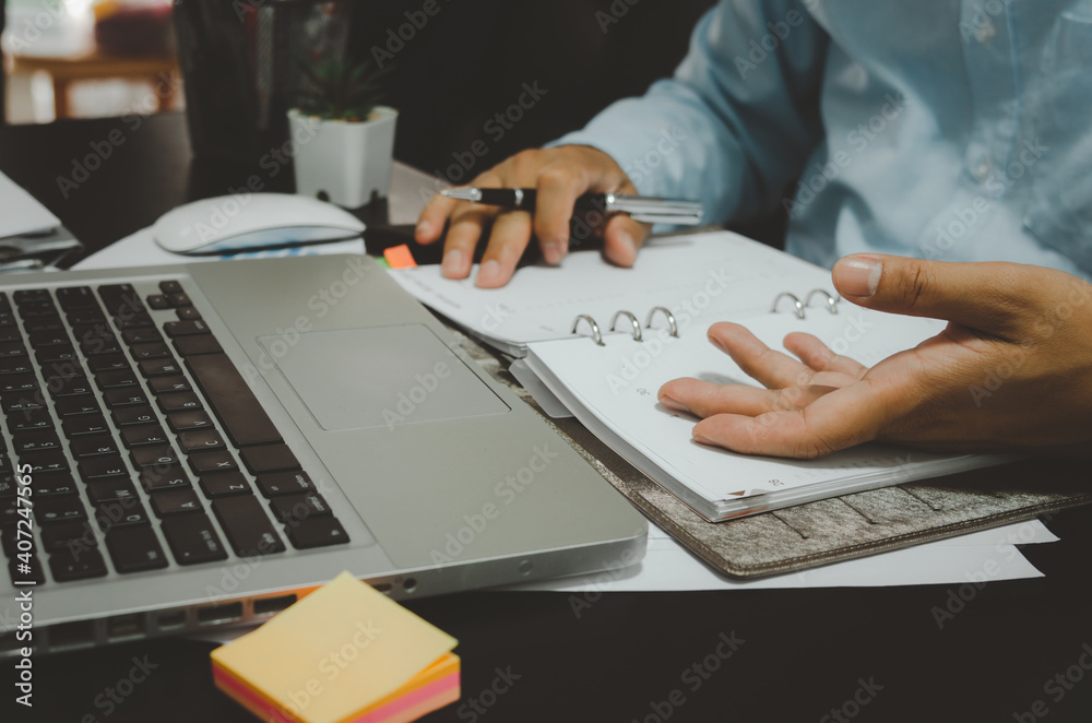 business man takes notes in a marketing strategy planner and statistics, looks at computer data.