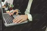 Businessman seacrh find information on Internet social media with computer laptop on desk. work for home.