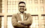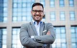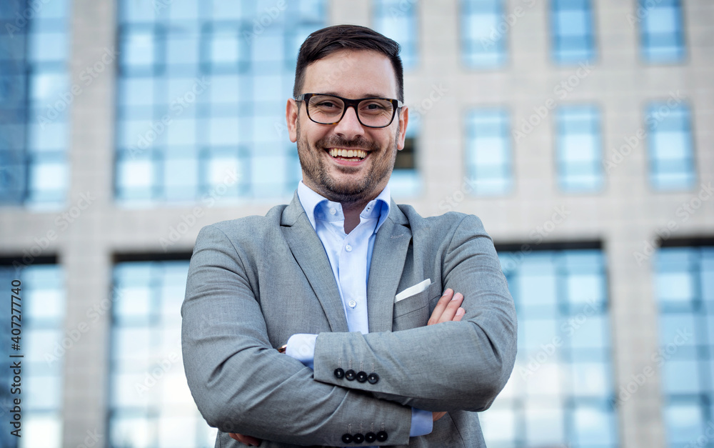 Smiling businessman in front of the corporation. Business, lifestyle concept