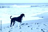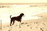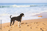 Dog on a tropical beach at sunset.