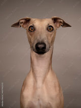 adorable and curious brown dog Italian greyhound with big brown eyes and big black nose portrait on grey and brown background in studio