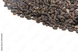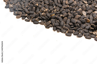 Spreading of luffa or loofah, luffa aegyptiaca seeds with copy space isolated on white background