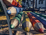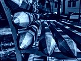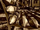 A pencil-shaped bench on the pedestrian alley. Sunny day