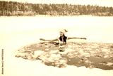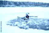 Winter swimming. Woman in frozen lake ice hole. Swimmers wellness in icy water. How to swim in cold water. Beautiful young female smiling. Gray hat and gloves swimming clothes. Nature lake in forest