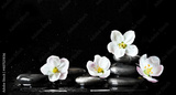 Spa stones and white flowers on black background with water.