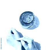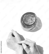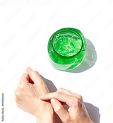 After sun cooling skin cosmetics. Woman is testing or applying aloe vera gel in a transparent jar top view.